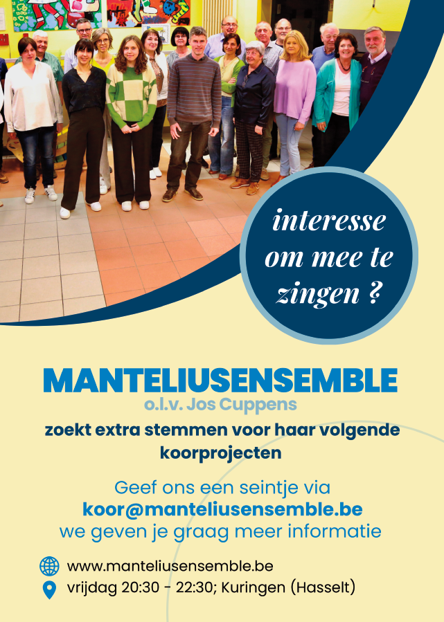 Manteliusensemble vzw - Godfried Bomansstraat 22, 3511 Kuringen - www.manteliusensemble.be - koor@manteliusensemble.be - BE 0431.403.540 - RPR Hasselt