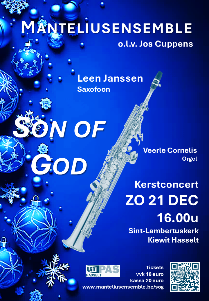 Het Manteliusensemble nodigt jullie graag uit voor haar kerstconcert getiteld “Son of God”, dat zal plaatsvinden op zondag 21 december 2025 om 16u in de prachtige Sint-Lambertuskerk in Kiewit, Hasselt. Zoals steeds mogen jullie rekenen op een met zorg samengesteld programma waarin het indrukwekkende werk Son of God Mass van de Britse componist James Whitbourn centraal staat. Laat u meevoeren door de meditatieve kracht van koorzang, orgel en sopraansaxofoon in een unieke muzikale ervaring. De Son of God Mass is een zeldzaam werk dat spiritualiteit en moderne klankkleuren samenbrengt. De saxofoon, die gespeeld wordt door Leen Janssen, fungeert als een woordloze solist en creëert een sfeer van verstilling en bezinning. Veerle Cornelis begeleidt op orgel. Een unieke kans om dit werk live te beleven in een prachtige akoestische setting.